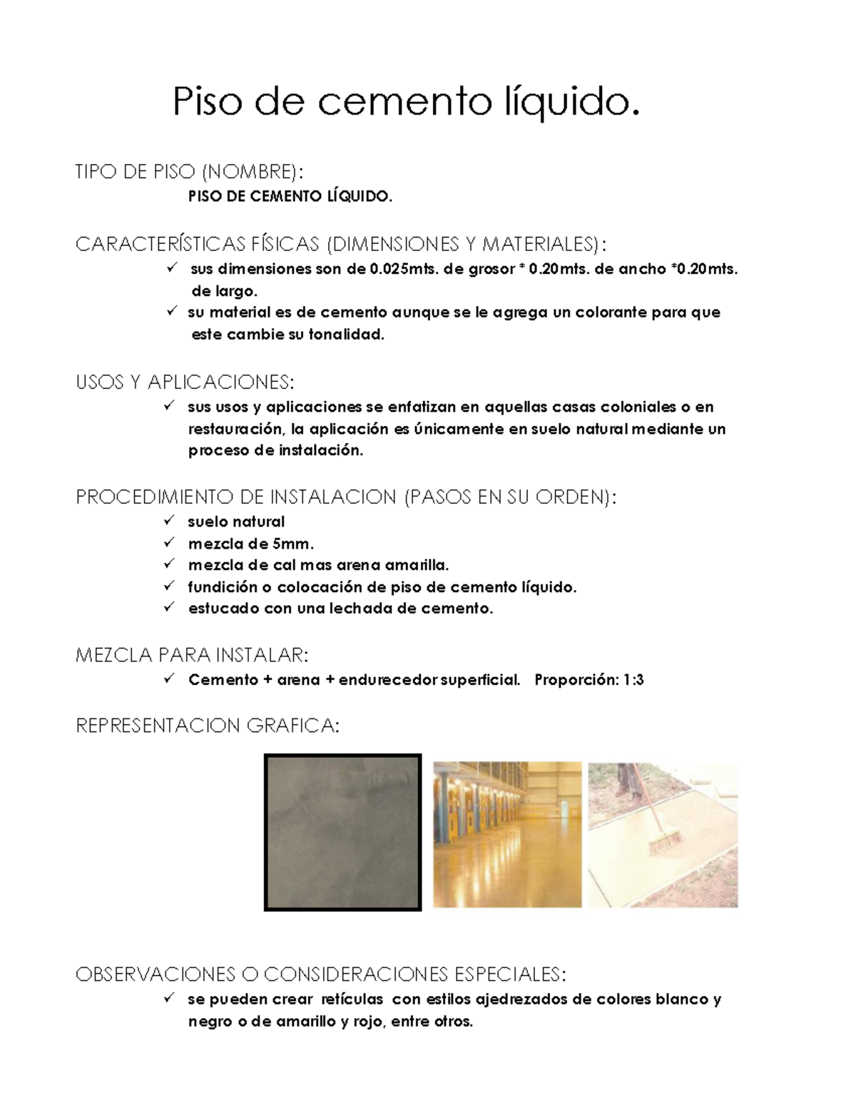 Sobre la placa o piso de concreto, limpiado previamente, se colocará un piso de cemento con un espesor mínimo de tres cuando la mezcla del acabado haya iniciado su fraguado, y luego de evaporada el agua, se aplicará el «ferrolith» en seco, en proporción de cinco (5). Si lo agregas a la capa superficial (al menos en los últimos 5mm), el piso de cemento alisado lucirá una apariencia totalmente distinta. Debe resistir el paso de camiones y el rodado inclinado de tambores de.